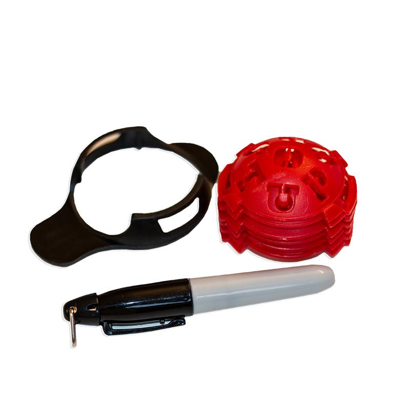 Beschriften Sie den Golfball mit verschiedenen Mustern, um ihn auf dem Platz leichter zu identifizieren. Zusammen mit dem wasserfesten Markierungsstift erhalten Sie mehrere Schablonen, mit denen Sie Ihren Ball einfach und schnell markieren können. Die Farbe des Kugelschreibers hält jedem Wetter stand und haftet fest am Ball.