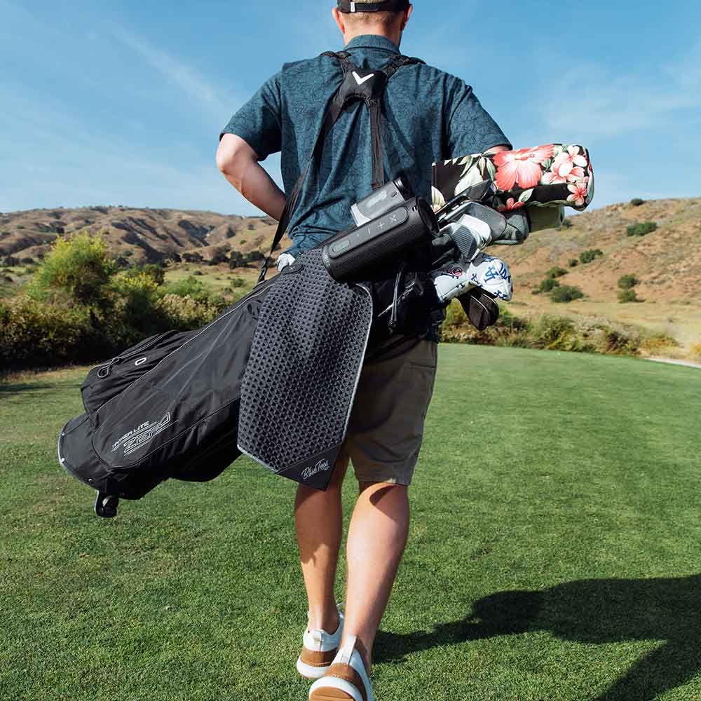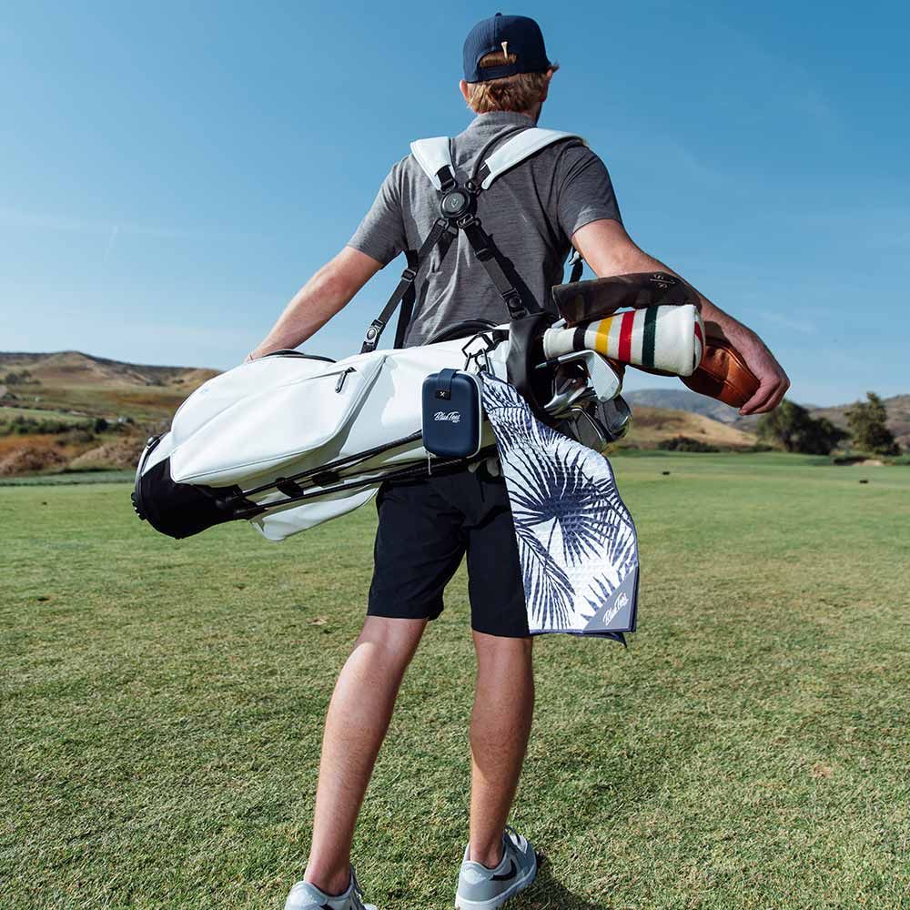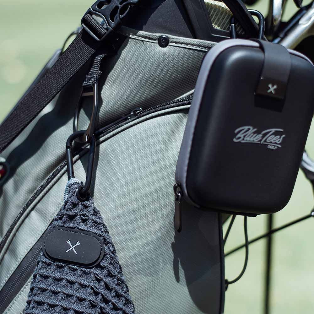 Befestigen Sie das Handtuch ganz einfach an Ihrer Golftasche, entweder mit dem im Handtuch integrierten Magneten oder dem mitgelieferten Karabinerhaken.